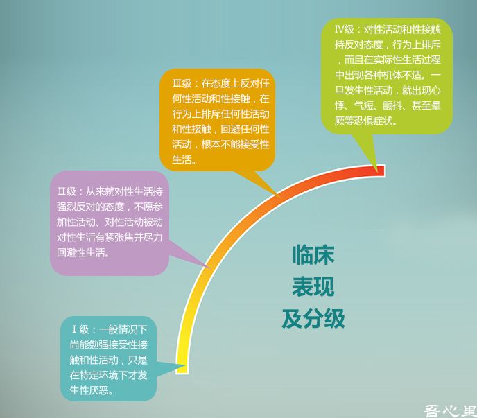 常见的表现为:回避性行为,对性行为或性想象过分焦虑、厌恶、甚至惊恐。对性活动产生一种持续性厌恶反应。重者即使是配偶爱抚、拥抱也可产生恶心、呕吐反应,性器官接触会产生情绪紧张、恐惧不安、心慌、全身颤抖、大汗淋漓、面色苍白、有大祸临头之感。